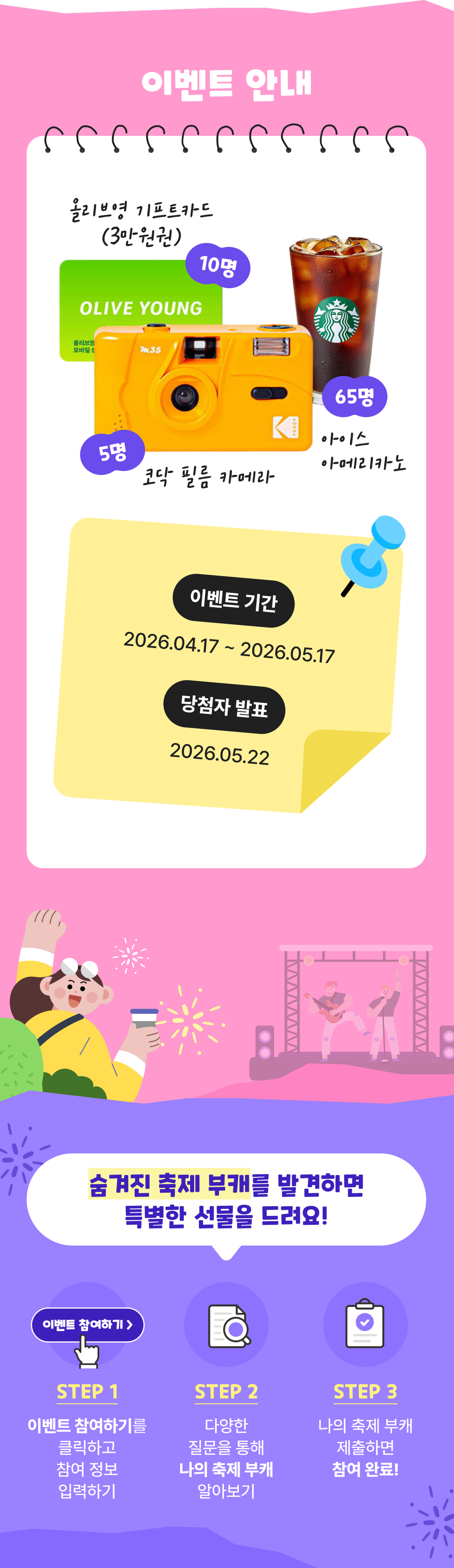 - 경품 발송은 당첨자 발표 후, 개인정보 취합 기간이 끝나면 일괄 진행하며, 당사 사정에 따라 연기될 수 있습니다.