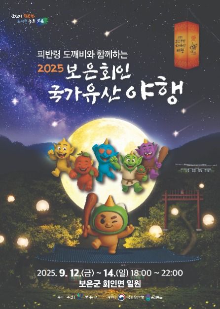 보은 회인 국가유산 야행보은 회인 문화유산 야행은 충청북도 보은군 회인면에서 2025년 9월 12일부터 14일까지 3일간 진행되는 전통문화 축제이다. 이번 축제는 '피반령 도깨비와 함께하는 인산인해 회인 야행'이라는 슬로건을 내세우며, 회인 지역 전체가 조선시대 분위기로 꾸며진다. 8夜(야) 테마를 중심으로 약 20여 개의 다채로운 프로그램이 마련되어 있다. 주요 볼거리로는 개성 넘치는 6명의 도깨비 캐릭터가 등장하는 유쾌한 난장 퍼포먼스가 있다. 이를 통해 방문객들은 실제 도깨비 마을에 들어선 듯한 비일상적 경험을 하게 된다. 온 가족이 함께 즐길 수 있는 전통놀이, 야간 탐방, 문화재 해설, 먹거리 장터 등 다양한 체험과 이벤트도 준비되어 있다. 축제 기간 동안 회인면 전체가 조선시대 마을로 재현되어, 문화와 역사를 아우르는 특별한 야간 체험이 가능하다. 피반령 도깨비 전설을 지역의 문화유산과 접목한 이번 야행은 회인의 정체성과 역사적 가치를 널리 알리는 데 의미가 있다. 여러 야간 콘텐츠를 통해 방문객에게 새로운 문화유산 향유의 기회를 제공한다.