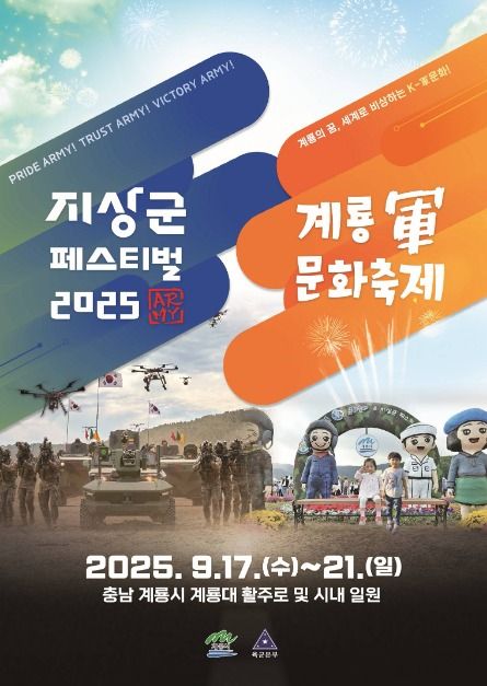 계룡軍문화축제"계룡의 꿈, 세계로 비상하는 K-軍문화!" 계룡軍문화축제가 9.17.(수) ~ 9.21.(일)까지 계룡대 활주로 및 시내 일원에서 펼쳐진다. 대한민국 명품 축제인 2025계룡軍문화축제는 개막 축하공연, 락 트로트, K-POP 등 장르별 軍문화 페스타 콘서트, 군악의장 초청 공연, 로드 퍼레이드 등 다채호운 공연 프로그램 및 익스트림 특별체험관 등 각종 체험 부대 행사로 軍문화의 위상을 높이고, 전세대가 함께 즐길 수 있는 다양한 콘텐츠를 선보일 예정이다. 특히 금년도는 '웰니스라이프 특별전시관'을 함께 운영해 군문화와 라이프스타일이 융합된 새로운 축제 콘텐츠를 선보일 예정이다.